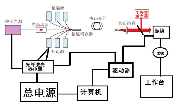 光纖激光打標機主要由激光電源、激光器、半導體激光指示器、光學掃描系統(tǒng)、微機、保護系統(tǒng)等部分組成。
